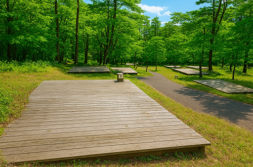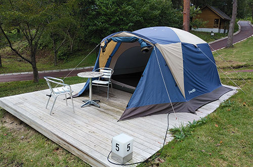 | 設 備 | 電源1,200W(コンセント差込口2箇所)まで使用できます。水道がCキャンプ場内、炊事場がBキャンプ場内にございます。 ウッドデッキ専用ペグ(ウッドデッキ上ではペグが使えないので専用ペグを活用してテントを張ってください。芝部分はペグ使用可能です) |